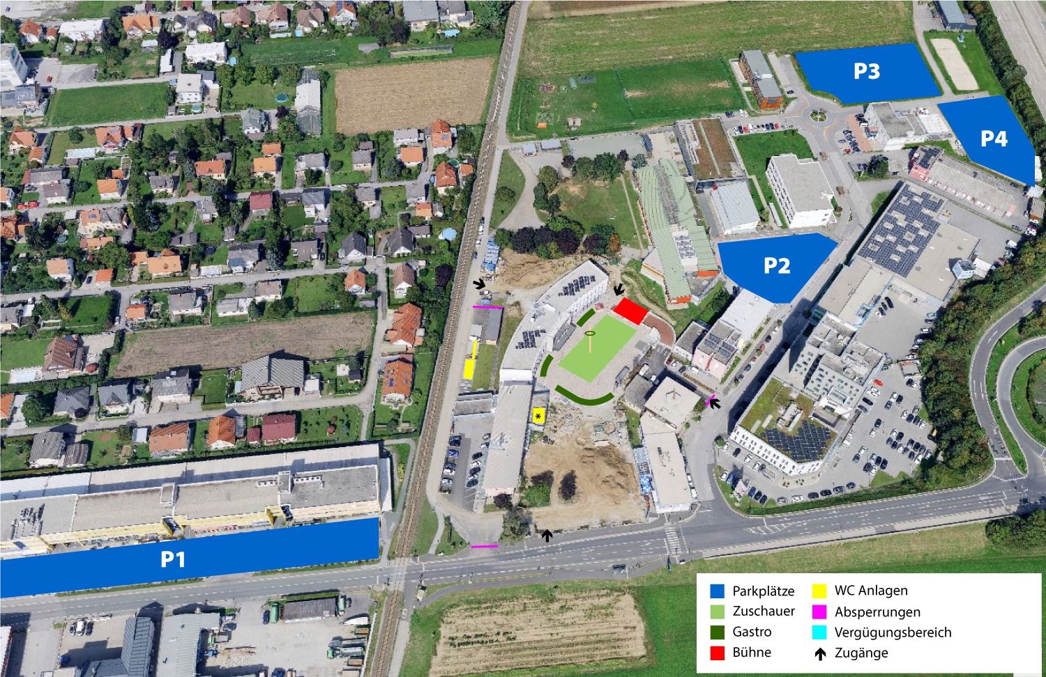 Bitte kommen Sie mit öffentlichen Verkehrsmitteln oder zu Fuß zu der Veranstaltung. Wenn das nicht möglich ist, nutzen Sie einen der insgesamt 4 gekennzeichneten Bereiche.