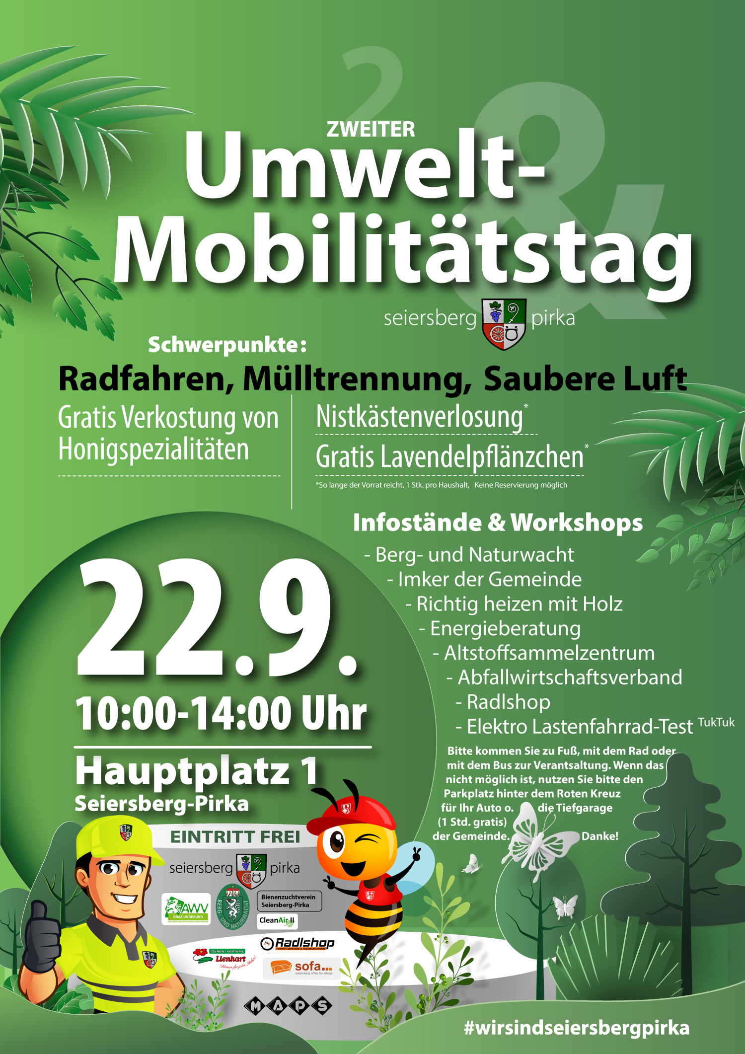 Die Gemeinde Seiersberg-Pirka lädt euch am Freitag, 22. September 2023 von 10:00 - 14:00 Uhr recht herzlich zum zweiten Umwelt- und Mobilitätstag auf den Hauptplatz vor dem Gemeindeamt ein!