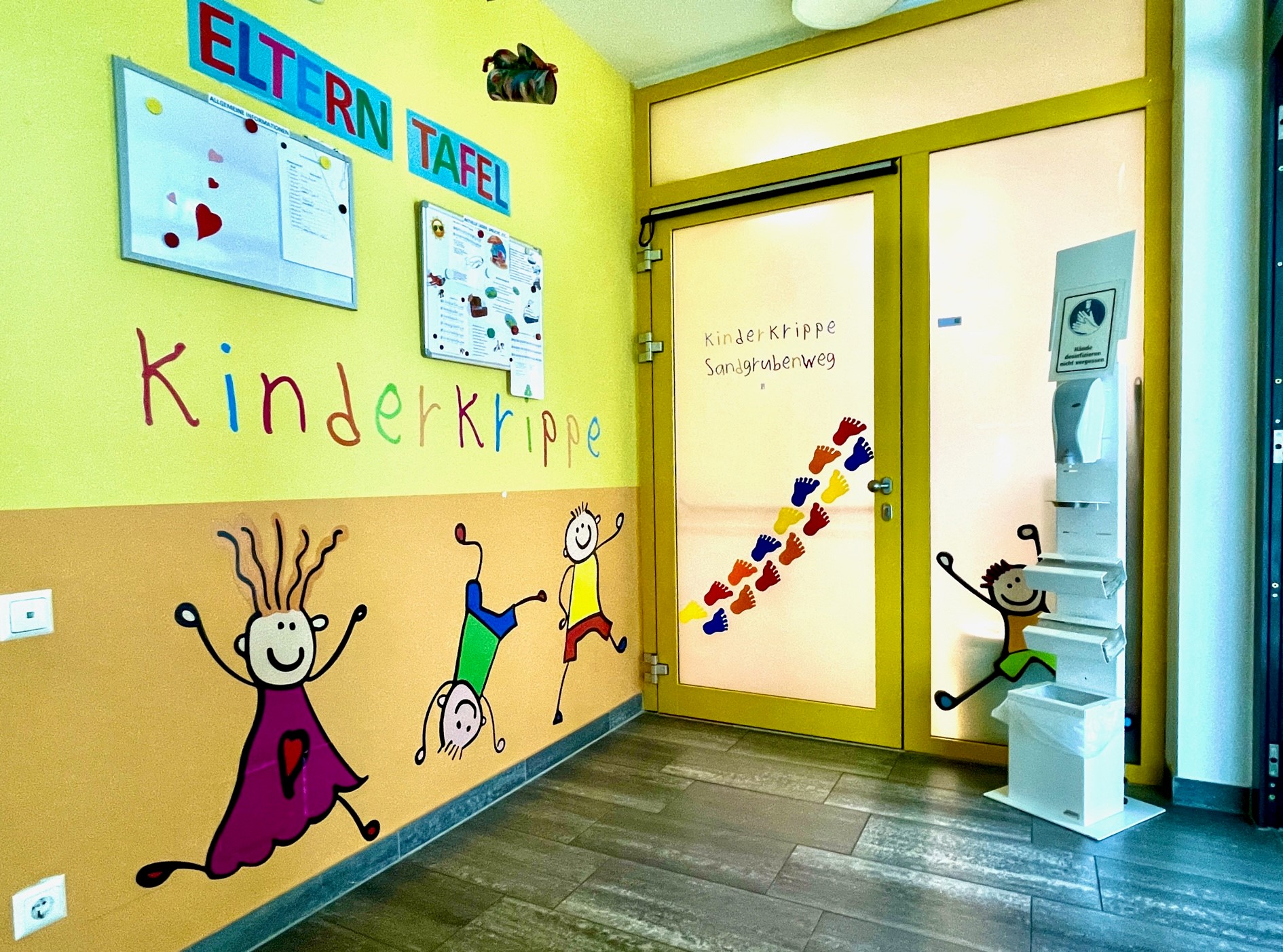 In der Kinderkrippe Sandgrubenweg werden in 2 Ganztagesgruppen, zu je maximal 14 Kindern pro Gruppe, Kinder von 18 Monaten bis zu 3 Jahren mit Wertschätzung, Einfühlungsvermögen und Kompetenz liebevoll betreut. Die individuelle Förderung und Zusammenarbeit durch die Beteiligung der Kinder von Anfang an liegt dem Personal besonders am Herzen.
